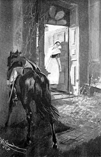 Presently a face appeared furtively at one of the up-stairs windows. The eyes thereof, having dwelt for an instant on the mounted party shivering in the road, opened wide in amazement, and a minute later, 28 after a sound of key-turning and bolt-drawing, the door opened, and a good-looking lady appeared in the doorway, backed up by a servant and two pretty children who clung, half-curious, half-frightened, to the lady’s skirts.