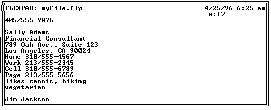 The above Only View shows all lines in the text file that contain sally adams'. The n next to the first two lines in the above graphic indicates that a Label is attached to the text, as opposed to plain text. The first line displayed a completed ToDo (a ToDo Label with the date 3/21/96 in its Done date field, followed by plain text describing the ToDo). The second is the appointment for the upcoming meeting (an Appt Label followed by the date and time of the appointment, followed by a plain text describing the appointment). The third has no Label, composed entirely of plain text, and is the first line of my entry for Sally Adams and her personal information. The fourth also has no Label, again entirely plain text, and is about a different person altogether. I move the highlight bar to the third entry and press (ENTER). Flexpad now displays this in Text View: