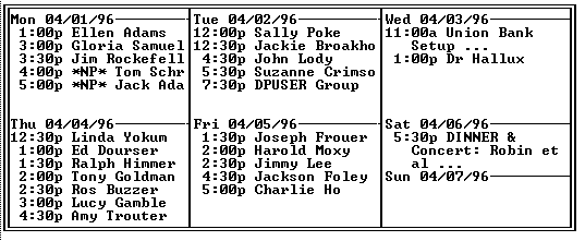 The Weekly Grid View can be used, as it is below, to get an overview of the schedule for the week. I use it to see where new patients are this week (*NP* indicates this), and where further notes are included (I use ...' to indicate the entry has more than one line in Text View).