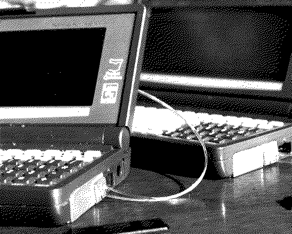 Two palmtops connected by plastic light fiber. The bracket that connects the IR fiber to the Palmtop is made by one user in Japan. (Photo courtesy of Michikazu "mkaz" Sakata.)