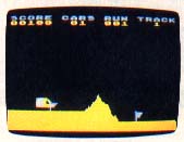 You will be racing through terrain along a horizontally scrolling track. Exact layout depends on which of the four tracks you selected from the title screen, by pressing the [SELECT] key. The E-Racer can only travel on level ground--hitting mountains, cliffs, water, or anything that is not flat ground will result in the loss of a car. Be careful, you only have two cars.